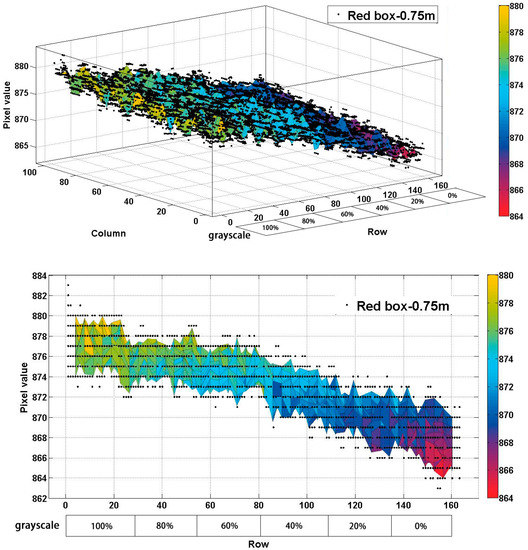 At the same distance, six kinds of different reflectivity in the red box on the stripe plane pattern (Figure 4b) affect the measured distance obviously. As shown in the top of Figure 7, with the reflectivity increases (row axis from small to large in Figure 7, or rows of the red box, top to bottom in Figure 4b), the measured distance becomes smaller at a distance of 0.75 m. Figure 6c also illustrates the fact for a distance of 0.75 m in the front view. Furthermore, it is presented clearly in the side view at a distance of 0.75 m in the bottom of Figure 7.