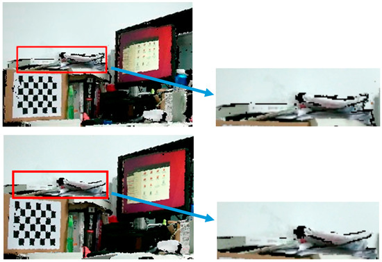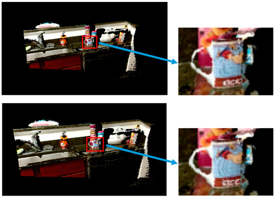 Furthermore, we apply the post rectification approach to the George Mason University (GMU) Kitchen Dataset [27], which is captured by a Kinect v2. Figure 11 shows the point cloud before and after correction by using our proposed method. According to the two red rectangles of Figure 11, we can find that the bottle is larger after using our post-rectification, while losing little information, which can support more useful scene information than without post-rectification. This is due to using precision depth data.