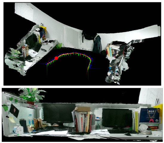 As shown in Table 6, with the decrease of reflectivity (an increase of the grayscale level), the expectation of offset is progressively rising. Then we average those six values of expectation to be the deviation of this indoor scene. After correction, an average of 118 mm deviation is eliminated. Via the offline RGB-D SLAM method, Figure 9 presents two kinds of point clouds magnified by the same multiples before and after correction by using our proposed method. Therefore, it is obvious that, after correction, the scene is closer to the Kinect v2 sensor than before in the point cloud, which indicates that the depth accuracy of the point cloud is improved. Moreover, an excellent visual effect point cloud of this indoor scene is displayed in Figure 10. The line in the middle of the top overall view is the trajectory of Kinect v2. The bottom is a side view at the red point position of the trajectory in the top overall view.
