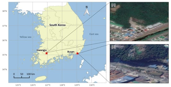 Map showing the study areas: (A) located in Gwangju and (B) located in Busan.