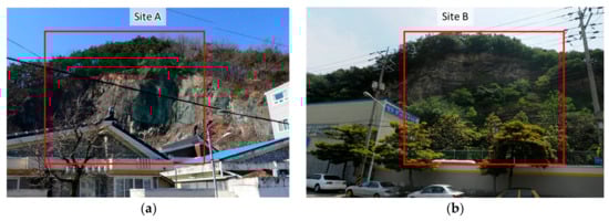 Lateral view of the study areas from the ground (street view of NAVER); (a) site A; (b) site B.