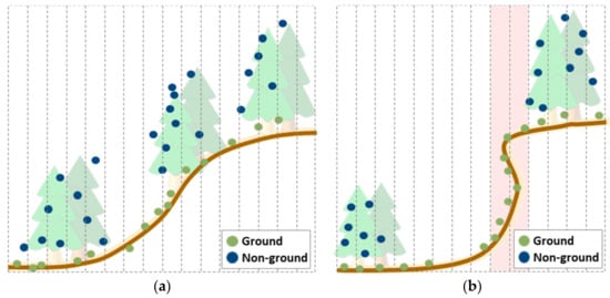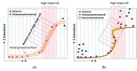 In the case of a high slope value; if only the point having the minimum height in the corresponding grid is extracted, the shape of the ground of the steep slope cannot be accurately extracted (Figure 5). Therefore, for a cell over a certain slope (δTh; slope angle threshold in Figure 4), the lowest point of each cell is extracted from the rotated axis based on the fitted plane in the corresponding cells (Figure 6a). Through this process, the side points of the portion where the slope changes abruptly are also extracted as seed points (Figure 6b). The slope angle threshold value depends on the data characteristics. In this study, 60°, which is more than the average slope value, was determined as slope angle threshold through experiments.