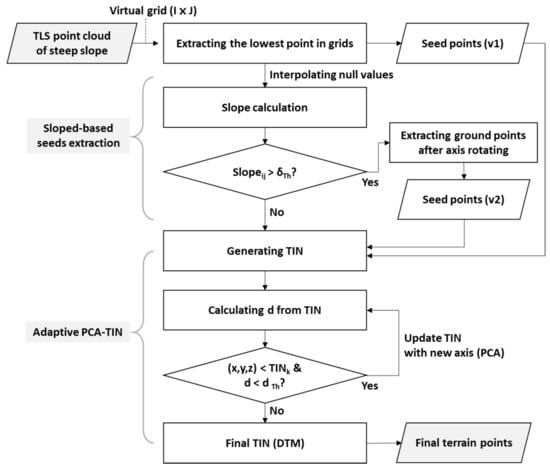 A flowchart of the proposed filtering algorithm (TIN; triangulated irregular network, PCA; principal component analysis, I; the number of rows of virtual grid, J; the number of columns of virtual grid, Slopei,j; slope angle of (i,j) in virtual grid, δTh; slope angle threshold, TINk; kth triangle, d; distance between a target point (x,y,z) and TINk, dTh; threshold value of d).