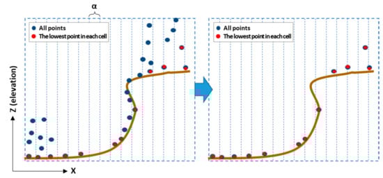 In this study, by generating a virtual grid, a minimum height value of the corresponding grid is extracted. To generate the virtual grid, the initial size of the grid is set to 1 m × 1 m. The size of the initial grid can be varied depending on the size or the range of the input data sets. A virtual grid was created on the X-Y plane, and the lowest point in the grid (height) was extracted as shown in Figure 5. It shows the X-Z plane of a steep slope, on which the red dots represent the lowest point of each grid.