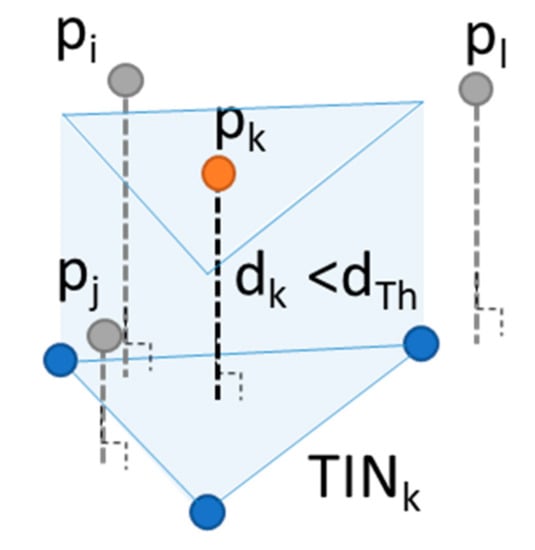 In this step, only the points that satisfy certain criteria are selected as candidates for updating the next TIN. The first criterion is the vertical distance from the TIN and the second one is whether the points are in the TIN plane or not. The threshold value (vertical distance) is generally the median of the histograms of the vertical distances of all the candidate points. Candidates below the threshold value are classified as ground points. Figure 7 shows the point selection process for updating TIN.