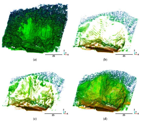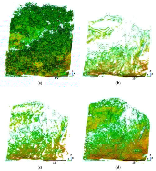 From visual inspection, we could evaluate how realistically the DTM visualized the terrain. Results are shown in Figure 8 and Figure 9. Figure 8 shows the intermediate and final results for the first study area, site A. Figure 8a shows the original data, and the final result of the ground point extraction is shown in Figure 8d. Figure 8b shows the lowest points before applying slope-based point extraction, and Figure 8c depicts the seed points for adaptive PCA-TIN. Since the seed points are supplemented by the slope-based point extraction procedure, it could be seen that the ground points were extracted clearly even in the areas where the slopes changed abruptly. However, some errors are included in areas where the point density is low. In case of site A, the density of points in the outer part is relatively low and there is a lot of vegetation. Figure 9 shows the filtering result for site B, which is the same as Figure 8. In the case of site B, although the overall point density is high, a lot of ground points were not obtained because of the thick vegetation. Except for the part where ground points are not well acquired, it could be seen that significant terrain features such as the suddenly rising hill or ridge are represented.