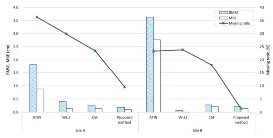 Table 2 and Figure 10 represent filtering results from each algorithm. As shown in Table 2, the RMSE for the DTM using the proposed algorithm was 1.84 cm and 2.13 cm in site A and site B, respectively. The proposed algorithm showed better performance than the other algorithms. Moreover, the data missing ratio, which means the percentage of missing cells in the DTM, is the smallest in the results of proposed algorithm. In case of the results of site B, WLLI showed much smaller RMSE and MBE values than the others. However, the RMSE values should be taken as a relative measure of the performance of our algorithm. This is due to the presence of uncertainty in manually filtering and the exception of data missing cells.