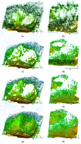 We compared the results of our algorithm with the results obtained using other algorithms to confirm the effectiveness of the adaptive PCA-TIN (Figure 11). Figure 11a–d were produced by other methods and Figure 11g,h were produced by the proposed algorithm. Referencing Figure 11, the empty part in Figure 11a–d should be noted because the ground points actually exist there. On the other hand, our filtering results, depicted in Figure 11g,h, showed better filtering performance in the area with a high slope gradient.