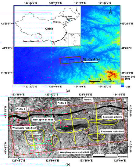 The study area, covering about 200 km2, is located in the Fushun coalfield in Fushun City, which lies 47 km east of the capital city Shenyang in Northeast China (Figure 1a). The Fushun coalfield is in a relatively small east-west-trending exposure of Mesozoic and Cenozoic rocks surrounded by Precambrian terrane [38]. The principal coal beds of the Fushun coalfield are low-sulfur subbituminous and bituminous in rank, are of limnic origin, and are contained in the 55-m-thick Eocene Guchengzi Formation [38]. The outcrops consist primarily of Mesozoic volcanic tuff, basalts, and weak interlayers (fractured zone), whereas the underlying bedrock is made up of Archaean granitic gneiss [39]. Fushun coalfields developed in the Hunhe fault of the Fushun basin [39]. The Hunhe River passes through the central part of the basin (Figure 1b). Figure 1 indicates the location of the study area in China and the distribution of typical regions.