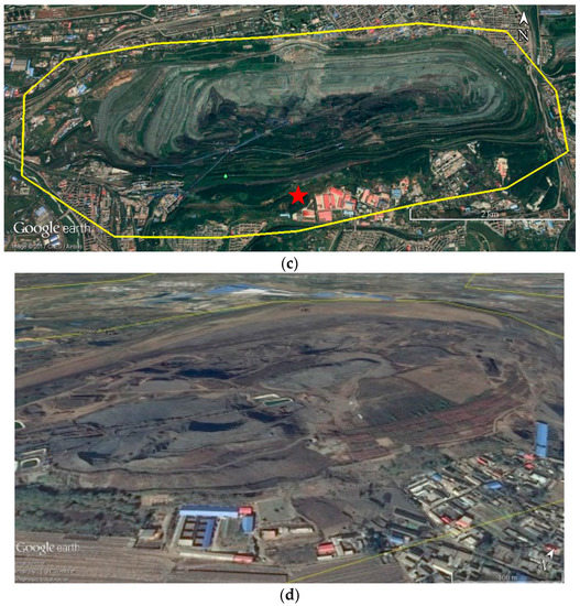 (a) Location of the Fushun study area. The red box marks the coverage of the study area in this study. The background is a shaded image of ASTER GDEM. The left-upper inset is an index map to mark the location of the study area in China. (b) Locations of five typical regions in the study area. The yellow polygons indicate the boundaries of the typical regions, which are the main open mining areas and waste rocks piling fields in the study area. The red triangles mark the locations of ground control points used in this area. The base image was captured by China’s ZY-3 satellite in October in 2015. (c) The scene of the west open-pit mine from Google Images in 2017. The pentacle indicates the location of Qiantai Mountain. (d) The scene of the Wangliang waste rocks field from Google Images.