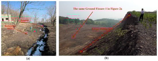 (a) A picture of ground fissure at the Qiantai Mountain peak on 16 March 2013 quoted from the article [8,22]; and (b) a picture of the same ground fissure at the Qiantai Mountain peak taken on 16 July 2014.