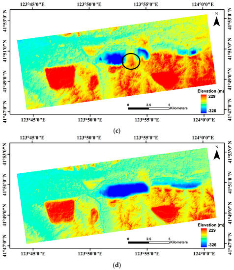 DSMs in the study area. (a) ASTER GDEM in July 2010 [40]; (b) ZY-3 DSM on 24 December 2013; (c) ZY-3 DSM on 21 April 2014 (the black circle indicates an area of high elevation not real). (d) ZY-3 DSM on 24 October 2015.