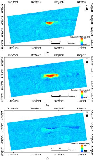 Overall ground deformation based on the elevation differences. (a) ZY-3 DSM in 2013 and ASTER GDEM; (b) ZY-3 DSM in 2014 and ASTER GDEM; and (c) ZY-3 DSM in 2015 and ASTER GDEM.