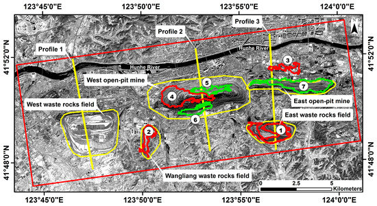 Profile 1 crosses the Hunhe River and the west waste rocks field; the elevation in the west waste rocks field rises slightly. Profile 2 crosses the Hunhe River and the west open-pit mine; the elevation level in the west open-pit mine rises too, but with a more complicated deformation. A landslide in the north slope of the mine pit occurred, as displayed in the topographic profile of 2015. At the same time, the south edge of the mining area moved further toward the south. The south slope shows a declining deformation; the elevation is decreased by 47.28 m in the arrow location for the landslide in the south slope of the pit. The results also demonstrate a large ground fracture.