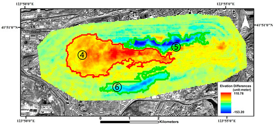 Districts 4–6 in Figure 7 are all in the west open-pit mine. Elevation increase and decrease are mixed together (Figure 8). District 4, with rising elevation, is mainly caused by backfilling. The results show that the backfill area is about 3.57 km2, the volume of backfill is about 1.37 × 108 m3, and the average rising elevation is about 36.35 m. The descending area (Districts 5 and 6) is mainly in the north and south pits. District 5 is located to the north of the slope, where small-scale mining is still continuing. At the same time, some small landslides often occurred. Therefore, the results show that the elevation is reduced by 41.77 m on average, the significant descending area is about 1.15 km2, and the descending volume is about 4.81 × 107 m3.