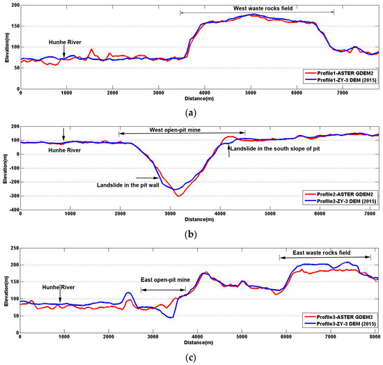 Three lines in Figure 7 indicate the detailed locations of the chosen profiles that crossed the active open mining pit and the waste field. Elevation values of the same profile are extracted from the ASTER GDEM and ZY-3 DSM in 2015. The results are shown in Figure 9. The topographic deformation along the profiles using elevation changes could be displayed.