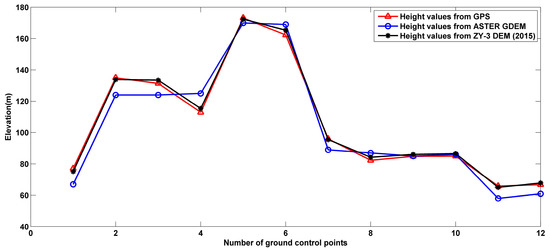 Comparison of height values extracted from ASTER GDEM and ZY-3 DSM (2015) with twelve ground control points.
