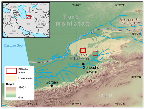 Overview of the study area in northeast Iran with the two different Pléiades satellite imagery extents. Data provided by Golestan Natural Resources and Watershed Management Central Office (loess areas), ASTER-GDEM2 and ArcWorld Supplement.