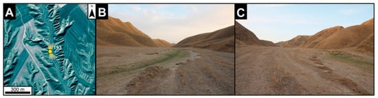 The loess plateau covers an area of about 2250 km2 in the Turkmen steppe of northern Iran (Figure 1). It is located at altitudes between about 45 m and 300 m above mean sea level. The base of the loess plateau belongs to the western part of the Kopeh Dagh Mountains. It is dissected in several fault blocks [39]. Differential tectonic uplift is expressed in several escarpments and in the sudden altitudinal rise at the boundary of the plateau. Tectonic uplift triggered deep erosion and valley incision into the loess and underlying strata, causing the pronounced relief of the loess plateau. It is characterized by steep slopes frequently dissected by deeply incised v-shaped side-valleys opening to larger valleys with broad floors. Both types are dry valleys with episodic runoff. The ridges in between the valleys rise to about 80 m above the valley floors and mostly consist of loess. Frequent loess wells, sinkholes, pipes and gullies reflect intense erosion processes at the land surface and below. Small scarp faces and hummocky toes indicate local slumping. In addition, the slope surfaces are covered by dense networks of sheep and goat tracks related to severe overgrazing in the area [38].