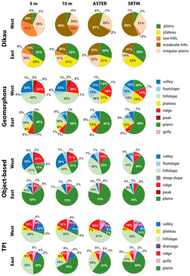 The results clearly point out that a geometric resolution of at least 10 m is necessary for an accurate classification of such a strongly dissected relief. With both 30 m DEMs, no approaches are able to achieve sufficient results. A comparison of the classification results of the western and eastern study area indicate that flatter areas are less sensitive to resolution changes. Furthermore, low spatial resolutions lead to an increase of homogeneity. Thus, it can be confirmed here that the flatter the landscape is, the lower the spatial DEM resolution can be to achieve accurate classification results. In this contribution, the best results were achieved with a pixel resolution of 5 m. For such a strongly varying landscape also a higher pixel resolution of around 3 m would probably effectuate results of similar quality, but higher pixel resolutions increase the risk of an over-classification of landforms. With a decreasing pixel size, too many micro-scaled landforms were identified, which were not necessary for further landscape interpretations [55].