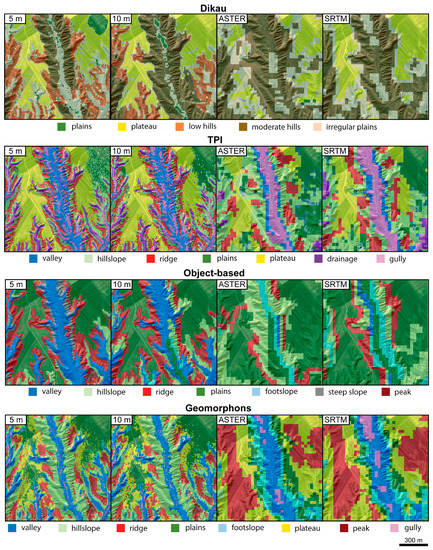 A comparison of the results in different spatial resolutions clearly demonstrates poor results for all approaches with both 30 m DEMs. Small landforms were not detected and the spatial accuracy of landform borders is less accurate. Only in extensive flat areas of the eastern part, a lower pixel resolution appears to result in a more homogenous classification compared to the high-resolution results. However, differences between the ASTER and the SRTM DEMs are recognizable. Generally, a higher suitability of the SRTM dataset for landform classifications was postulated by several authors [52,53,54]. This can be confirmed here as the use of the SRTM DEM results into a more homogeneous landform classification.