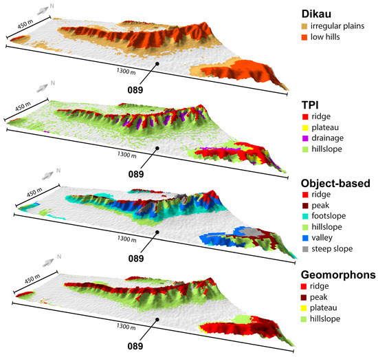 In this study, Dikau’s approach achieved the lowest accuracies. Moreover, the classification results reveal the least relief differentiation compared to the other approaches. Overall, this approach seems to be least suitable for the classification of such a strongly dissected landscape. Due to its possible landform classes, it is probably more appropriate for the classification of landforms in other spatial scales. In addition, many authors demonstrated in their work a better suitability of the Dikau approach for landscapes on macroscales [11,49,50,51].
