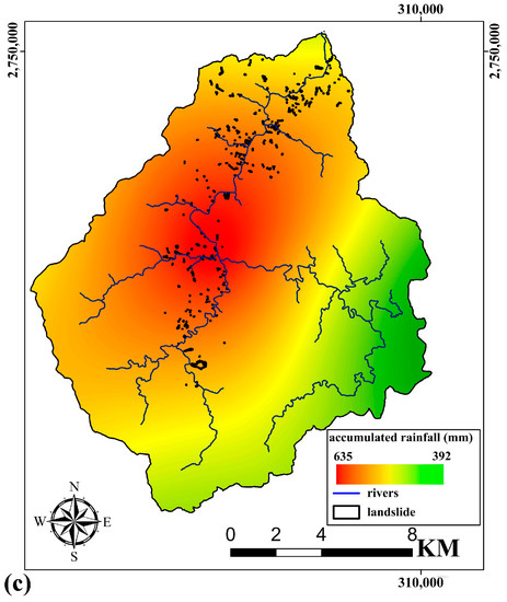 The distribution of accumulated rainfall during typhoon events and landslide in the LRW (a), NoRW (b), and NsRW (c).