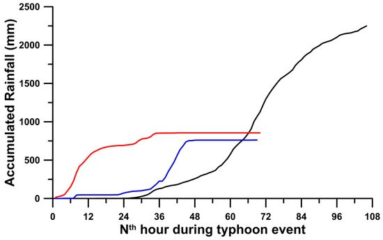 The accumulated rainfall distribution of Tengzhi rainfall station (black line) during 2009 Typhoon Morakot, Gulu rainfall station (red line) during 2010 Typhoon Megi, and Fushan rainfall station (blue line) during 2015 Typhoon Soudelor.