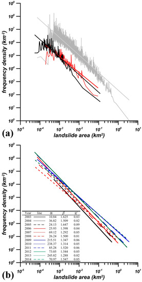 Figure 5b shows the landslide frequency density-area distribution from 2003 to 2014. The range of landslide areas for total landslides spanned less than six orders of magnitude from 5 × 10−5 to 2 × 101 km2 from 2003 to 2008, which enlarged to seven orders of magnitude from 5 × 10−5 to 3 × 102 km2 in 2009 (the maximum span from 2003 to 2014), and narrowed to seven orders of magnitude from 4 × 10−5 to 2 × 102 km2 in 2013.