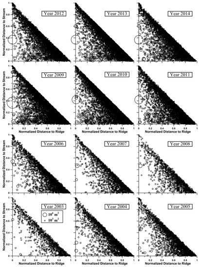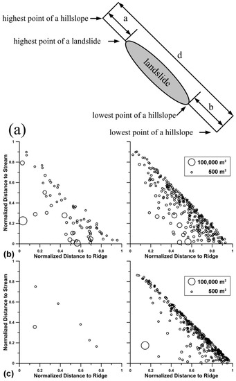 The analysis of the relative position of a landslide on a hillslope, termed topographic position analysis, was suggested by [32] for determining the main inducing factor for landslides. Three parameters were used in the analysis, namely the distance (a) from the ridge of the hillslope to the highest point of the landslide, the distance (b) from the nearest river at the toe of the hillslope to the lowest point of the landslide, and the total length of the hillslope (d). The normalized distances to ridge (a/d) and to stream (b/d) were used as dimensionless coordinates (x, y) of the topographic position analysis plot. Each landslide case in the landslide inventory was plotted according to its relative position on a hillslope by using a circle indicating the area of the landslide. The circles located in the upper-left portion (a/d < 0.5 and b/d > 0.5) of the plot meant that the landslides were located near the ridge of the hillslope (termed as upslope landslide), whereas those located in the lower-right portion (a/d > 0.5 and b/d < 0.5) of the plot meant the landslides were located near the toe of the hillslope or close to the river (termed as downslope landslide). Circles located in the lower-left portion (a/d < 0.5 and b/d < 0.5) of the plot meant that the landslides were located in midslope locations (termed as midslope landslide) and usually had large landslide areas. Most upslope landslides are earthquake-induced [32], whereas most downslope landslides are rainfall- or flood scouring-induced [7,8].