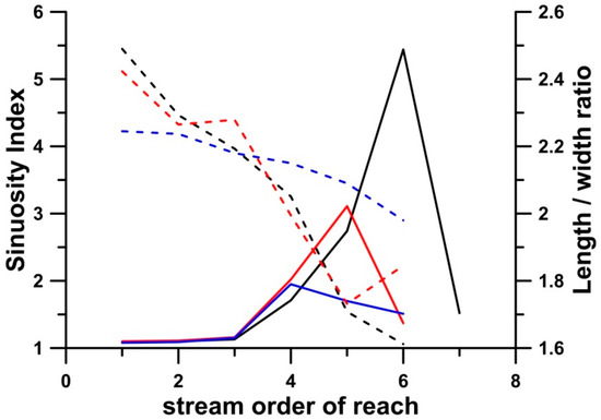 Figure 7 shows the mean SI value in reaches with various SO values in the three watersheds. The mean SI value in reaches with SO values of ≤3 ranged from 1.08 to 1.13 in the LRW, 1.10 to 1.16 in the NoRW, and 1.08 to 1.15 in the NsRW. The mean SI value in reaches with SO values of ≥4 was greater than 1.50 and peaked in reaches with SO = 6 in the LRW; moreover, the mean SI value ranged from 1.37 (reaches with SO = 6) to 3.11 (reaches with SO = 5) in the NoRW and from 1.51 (reaches with SO = 6) to 1.95 (reaches with SO = 4) in the NsRW. The reaches with SO values of ≤3 in the three watersheds are sinuous reaches, whereas those with SO values of >4 are meandering reaches.