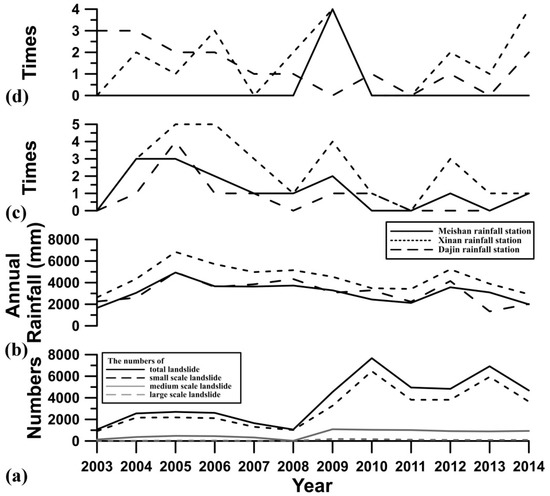 The numbers of landslide (a), including total landslide (black line), small scale landslide (black dash line), medium scale landslide (grey line), and large scale landslide (grey dash line) and annual rainfall (b), the times of RD > 350 mm (the standard of heavy rainfall, (c), and the times of RI > 70 mm/h (d) according to the records of Meishan (black line), Xinan (black point line), and Dajin (black dash line) from 2003 to 2014 in the LRW.