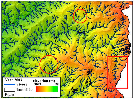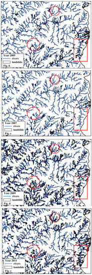 We applied the multiyear landslide distribution derived in a subwatershed (Figure 1 and Figure 9) to explain the long-term evolution of landslides in the LRW. No large-scale landslide case occurred in the subwatershed of the LRW from 2003 to 2007. The location of landslides caused by Typhoon Morakot can be classified into three types: not beside rivers, beside rivers, and in the source area of rivers. The small landslides not located beside rivers gradually disappeared (i.e., through vegetation recovery) within four years. The landslides located beside rivers, especially the sinuous or meandering reaches (red rectangle in Figure 9), either developed gradually into large-scale landslides or disappeared slowly. The landslides located in the source area of rivers (red circle in Figure 9) gradually developed into large-scale landslides. The locations of the large-scale landslides caused by Typhoon Morakot could be verified in the aforementioned analyses. The large-scale landslides that were caused by Typhoon Morakot occurred only in two locations. The first was in a source area of a river and was a combination of several historical small-scale landslides (red circle in Figure 9). The second was beside a sinuous or meandering reach (red circle in Figure 9).