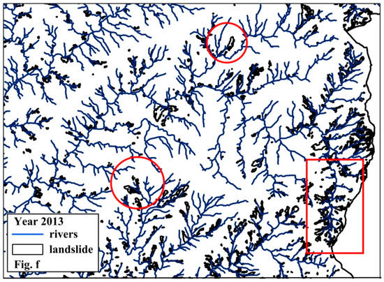 Table 2 presents statistical data of the landslide inventories in the three watersheds. The numbers of total landslides and large-scale landslides in the LRW were considerably greater than those in the NoRW and NsRW, as were the landslide densities in the watershed and within 200 m of rivers. The landslide densities within 200 m of rivers in the three watersheds were clearly greater than those in the watersheds, thus implying that landslides caused by extreme rainfall events were strongly centralized beside the rivers.