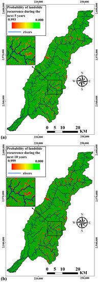 If the grids had never been recognized as landslides from 2003 to 2014, the total time of landslide occurrence was 0; however, we used 0.001 instead of 0 to avoid a calculation with no meaning. Figure 9 shows the probability distribution of landslide recurrence during the next 5, 10, and 20 years in the LRW. The mean probabilities of landslide recurrence during the next 5, 10, and 20 years in the LRW (Figure 10) were determined to be 7.26%, 9.16%, and 10.48%, respectively, whereas those in the area within 200 m of rivers were 10.47%, 13.33%, and 15.41%, respectively.