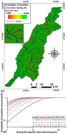 where is the exceedance probability and is the mean landslide recurrence interval, which should be estimated from multiannual landslide inventories. We utilized the Poisson model with the multiannual landslide inventories from 2003 to 2014 to estimate the landslide recurrence probability in the LRW during the next specific time interval.