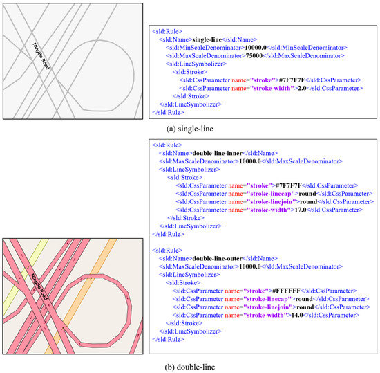 There are two basic approaches to represent road networks in a topographic map: single line (Figure 1a) and double line (Figure 1b, also called a “cased line”). The single-line approach can describe the spatial distribution of a road network concisely, whereas the double-line can be used to more clearly represent the vertical relationship of two roads at an intersection [26,27]. With the help of the Styled Layer Descriptor (SLD) specification proposed by the Open GIS Consortium (OGC), both of these approaches can be implemented by using the Stroke element [28,29]. As shown in Figure 1, the Stroke element contains a range of symbolization parameters, such as colour, width, line cap, and line join. For the single-line approach, road networks can be drawn by using the symbol with one Stroke, and for the double-line approach, the symbol can be constructed by using two different Strokes (one for the inner line and one for the outer line).