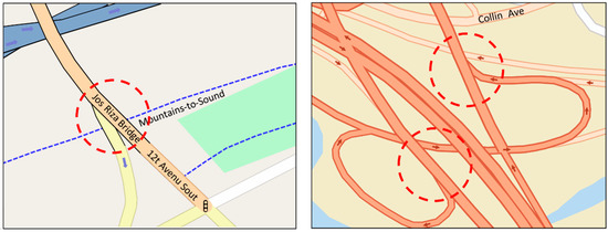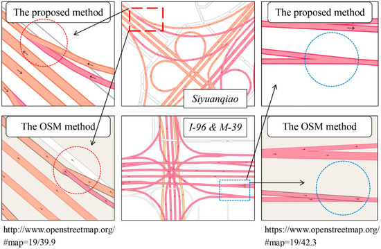 As shown in the experiments, the proposed method handles the various spatial relationships of road intersections correctly in map representations. Using the mask-based automatic method can also represent these spatial relationships; however, the rendering effect is influenced by the shape of these masks. As shown in Figure 15 and Figure 16, some “splits” can be formed when the intersected geometries are too small. To avoid this “too small” problem, the mask-based method is employed in the OSM platform by directly treating all bridges (the “bridge tag” as “yes”) as masks. This approach still encounters the problem that a bridge may cover a road. In Figure 17, some detailed rendering effects of the proposed and OSM methods are presented for comparison.