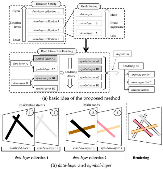 Regarding these problems, the method of building a rendering list for road networks has been studied in the fields of Cartography and Geographic Information Systems (GIS) [24,25]. In utilizing this rendering list, the process of rendering road networks is primarily based on the “Painter Algorithm”. This algorithm uses a bottom-up strategy [29], wherein road elements at the top of the rendering list are drawn last. Accordingly, the three major methods for rendering road networks are described below.