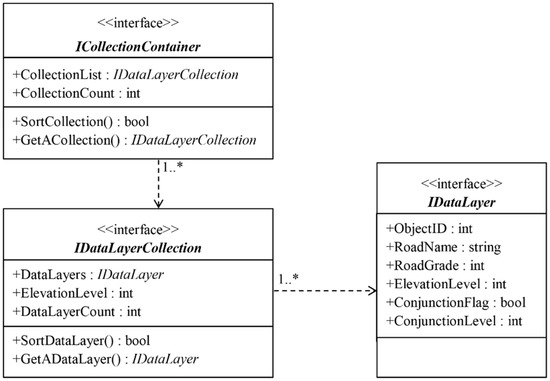IDataLayer stores the essential properties of rendered road elements. The ObjectID attribute defines the unique identification associated with geometric information. The RoadGrade attribute indicates the grade of road elements, and the ElevationLevel attribute provides vertical elevation information. The RoadGrade and ElevationLevel attributes can be customized to use an external classification method. For example, the RoadGrade attribute may include 0 (other roads), 1 (village road), 2 (township road), 3 (county road), 4 (provincial road), and 5 (national road); whereas, the ElevationLevel attribute may include 0 (underpass), 1 (ground), 2 (overpass), 3 (second overpass), and 4 (third overpass).