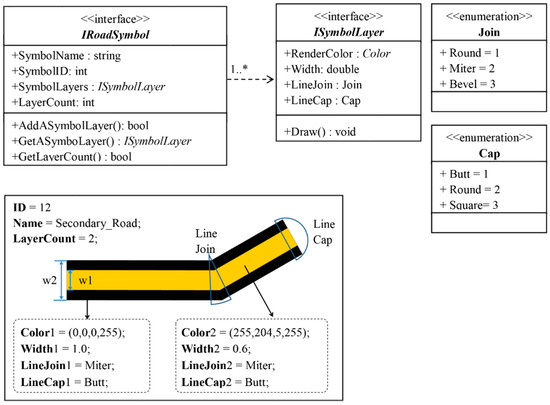 The ISymbolLayer interface mainly describes the rendering colour and width, which significantly influence the drawing of road element effects. In ISymbolLayer, RenderColour indicates the drawing colour, Width indicates the drawing width, LineJoin indicates the join type at the corner of two intersecting line segments (a Join enumeration is used to indicate Round, Miter or Bevel joins), and LineCap is used to determine how to draw the start and end of a line or set of lines (a Cap enumeration is used to indicate Butt, Round or Square).