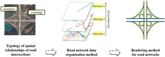 Road networks are widely distributed in urban environments and have played key roles in a range of urban modelling studies, such as urban growth simulation [1,2], urban transportation modelling [3,4], and city road noise simulation [5,6] studies. Maps are widely used to describe geo-spatial objects and communicate geo-information to map users, especially in the process of conducting virtual urban geographic experiments [7,8,9,10,11,12,13,14]. In topographic map representations, the rendering of road networks usually requires data selection, cartography generalization, legend design and other related work [15,16,17]. Generally, roads in road networks are organized in different linear map layers that are drawn by using different linear symbols (with different colours, widths, textures and other symbol attributes) according to the grade and elevation information. To clearly show the connectivity and spatial distribution of road networks in a map, complexity and difficulty primarily manifest in the handling of spatial relation information on road intersections [18,19,20]. The spatial relationships of road intersections are typically complex because of differences in the connectivity of different roads; for example, roads may cross each other at the same level, bridges may cross over other roads, and highway ramps may link different roads at different elevations. Drawing road intersections formed by two different road elements without considering their spatial relationships can generate confusion because it may be unclear whether the two roads are connected, especially for typical cases, such as accessibility analysis [21,22]. Therefore, accurate and clear representations of the spatial relationship of road intersections in maps are important for providing map readers with a comprehensive understanding of road networks [23,24,25].