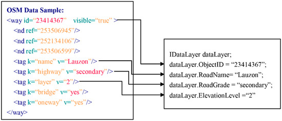 Figure 8 introduces the process of using OSM data to prepare road network data. OSM data provide essential information that includes the “layer tag” (which describes vertical relationships among crossed roads or overlapped roads), the “highway tag” (which indicates the importance of roads), the “bridge tag” (which describes the road segment as a bridge) and other attributes [39]. The “layer tag” can be directly used as the ElevationLevel parameter in the IDataLayer that provides the vertical elevation information. The “highway tag” value can provide the road grade information, and the “bridge tag” can be used as an auxiliary attribute to generate the road grade information. Thus, it is easy to import OSM data into this method.