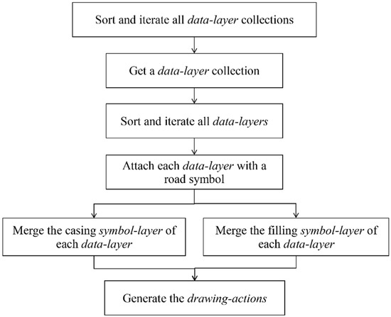 By attaching a road symbol to each data-layer, the drawing-actions can be formed. Based on the sorted data-layers and the decomposed symbol-layers, a sorted drawing-action array can be built and then registered to the rendering list. Using this rendering list, the rendering process of a road network can be conducted, with the spatial relationships handled by the successive drawing-actions of this process. With the development of map design research, approaches similar to the proposed data-layer and symbol-layer concepts have been effectively used to organize geospatial data for map presentation. However, the spatial relationships of road intersections are rarely considered in the rendering process. In this paper, spatial relationship information associated with road intersections is integrated into data-layers and symbol-layers.