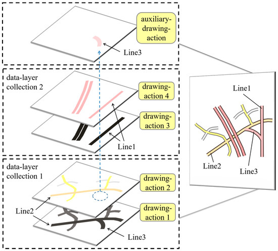 For the second data sample (right panel of Figure 12), the road network data are processed as three data-layer collections (Collection1, Collection2 and Collection3), and the conjunctions are organized into two “auxiliary-drawing-actions”. The rendering process is shown in Figure 14. The first and second data-layer collections (i.e., Collection1 and Collection2) can be rendered successively. After rendering Collection2, “auxiliary-drawing-action-1” should be checked and rendered if any conjunction roads occur between Collection1 and Collection2. The rendering of Collection3 and “auxiliary-drawing-action-2” are handled similarly.