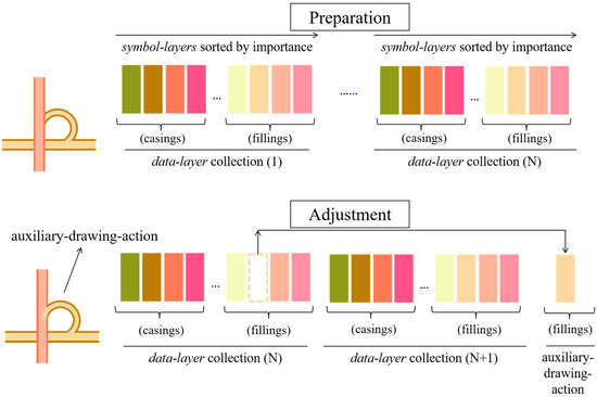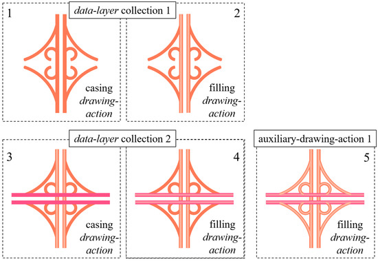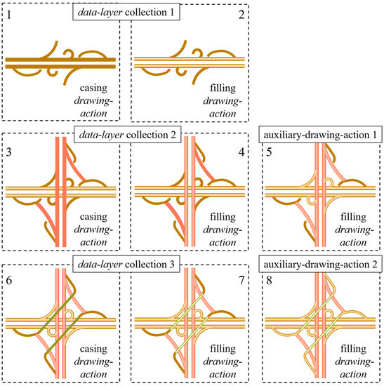 In the adjustment step, the ConjunctionFlag (as introduced in Section 3.1) is used to determine whether a road element needs to be adjusted. As shown in the bottom part of Figure 11, if the ConjunctionFlag of a data-layer is set to true, the corresponding drawing-action (filling) should be removed from its original rendering order and then inserted at the end of the next data-layer collection. This adjustment process does not affect other drawing-actions, and the iteration process in the implemented programme is linear (which can greatly improve the rendering efficiency).