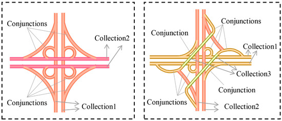 In the first data sample, the roads at the lower elevation level connect with the roads at the upper elevation level by eight loop ramps. As shown in the left panel of Figure 12, the road network data are processed as two data-layer collections (Collection1 and Collection2), and the conjunctions are organized into one auxiliary layer. When rendering this road network to a map, the rendering order flows from Collection1 to Collection2 to the auxiliary layer. Figure 13 shows the rendering process.