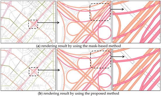 In the first sample dataset, the Siyuanqiao junction (in Beijing, China) was selected. The Siyuanqiao junction is an extremely complex structure consisting of twenty ramps and twenty-six bridges, and the dataset contains 1118 linear elements and 5987 vertices. Figure 15 shows the results for this sample dataset rendered by using the mask-based method and the proposed method.