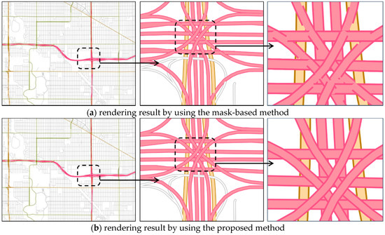 When rendering the Siyuanqiao sample dataset, the total time for the mask-based method was 405 milliseconds (including 61 milliseconds for the topological computation and 344 milliseconds for rendering), whereas the total time required by the proposed method was 252 milliseconds. This paper’s approach requires significantly less time than does the mask-based method because the proposed method does not have to calculate or analyse any additional topological relationships. In addition, the rendering time using the proposed method is less than that using the mask-based method. This is mainly because the mask-based method needs to draw auxiliary masks. The original line segment count of the Siyuanqiao sample dataset was 1118. For the proposed method, two symbol-layers (casing and filling) were employed in the experiment, and the rendering segment count was thus 2236 (double the number of line segments); for the mask-based method, extra segments (i.e., masks) needed to be rendered, resulting in total rendering segment count of 2670. The time comparison of rendering the I-96 & M-39 sample dataset yielded similar results. Therefore, the proposed method can greatly improve the rendering efficiency of road networks.