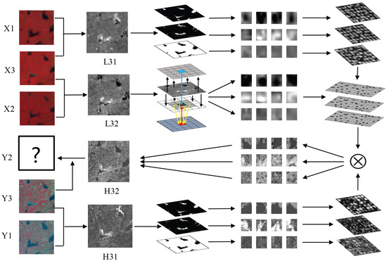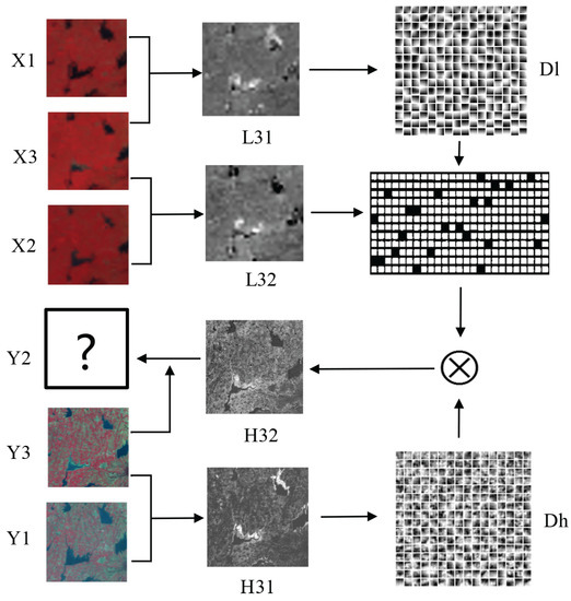 where represents the MODIS image on , represents the MODIS image on , and is the difference images for dictionary training. Instead of working directly with difference images, we rely on the patches sampled from and . For class k, the training patches of size are extracted by the operator from the difference images in location i. The low-resolution patch and high-resolution patch can be represented as follows: